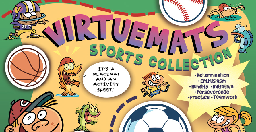 VirtueMats are printed placemats with activities around a virtue. Then these fun filled mats are grouped into collections that have a theme. Our first collection is our Sports Collection. In this collection we explore 7 virtues in a way that engages kids in that period before a meal and gives the parents a chance to get the food prepared.